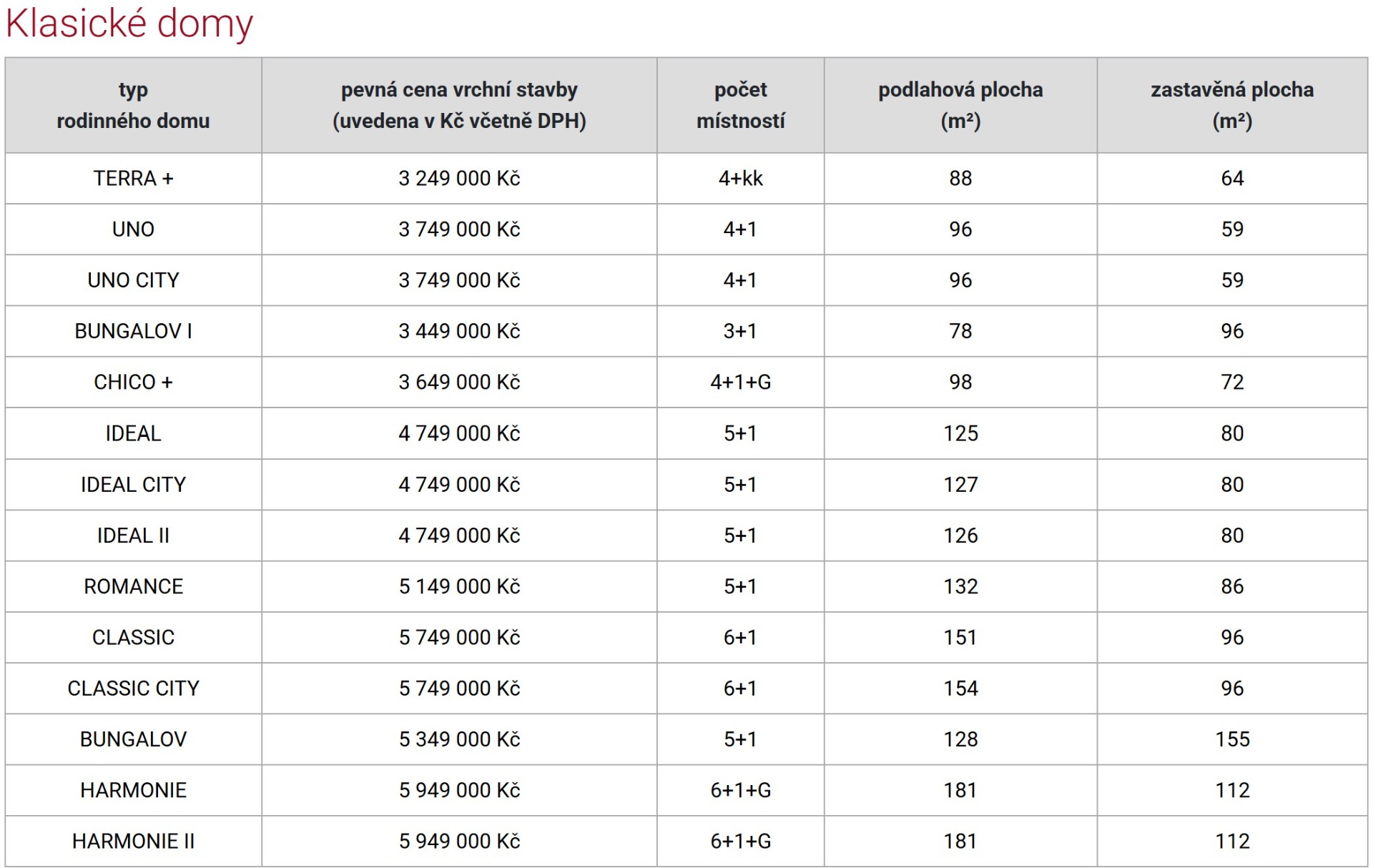 Uvedené ceny jsou platné pro Českou republiku, pro smlouvy o dílo uzavřené v období od 1. 1. 2026 do 30. 6. 2026. Ceny jsou uvedeny včetně 12% DPH. Základní cena rodinného domu ve standardním provedení dle typové dokumentace neobsahuje cenu základové desky, kterou si můžete realizovat sami, nebo si dodávku můžete objednat spolu s vrchní stavbou.